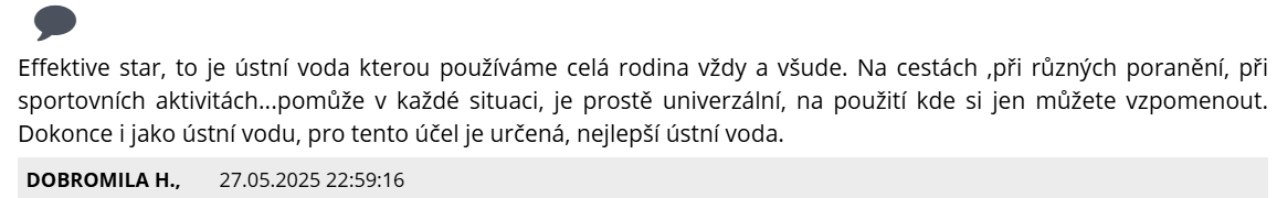EFFECTIVE STAR je vysoce efektivní ústní voda pro posílení programu ústní hygieny. Poskytne svěží dech na dlouhou dobu a v jakékoliv situaci. Obsahuje antium dioxid – silný likvidátor pachů, jenž ničí mikroskopický film utvořený na povrchu zubů a dásní ze zbytků jídla. EFFECTIVE STAR má silný protibakteriální a dezinfekční účinek. Jeho účinek je opravdu silný, avšak naprosto bezpečný a spolehlivý i při vnitřním použití.